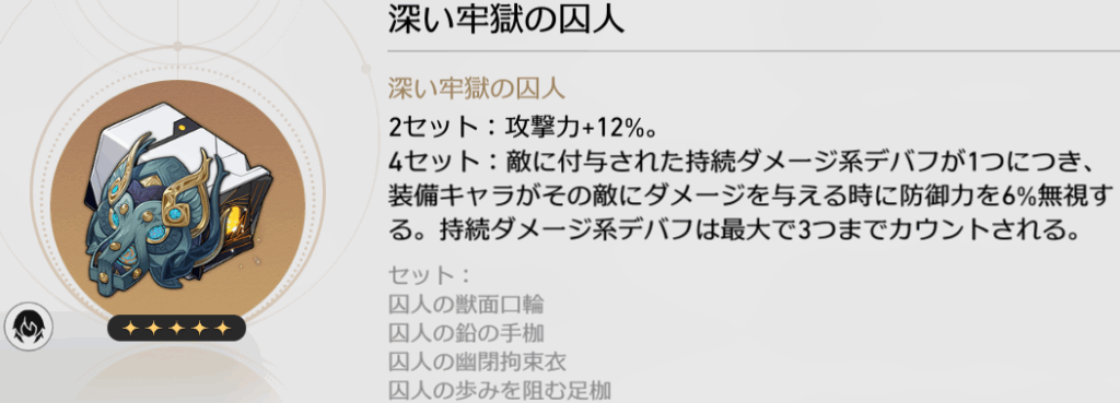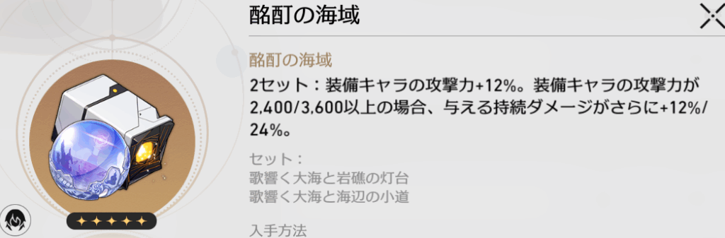 セイレンスの遺物は、囚人+海域セットが最適。どちらも持続ダメージキャラ用の最適遺物です。