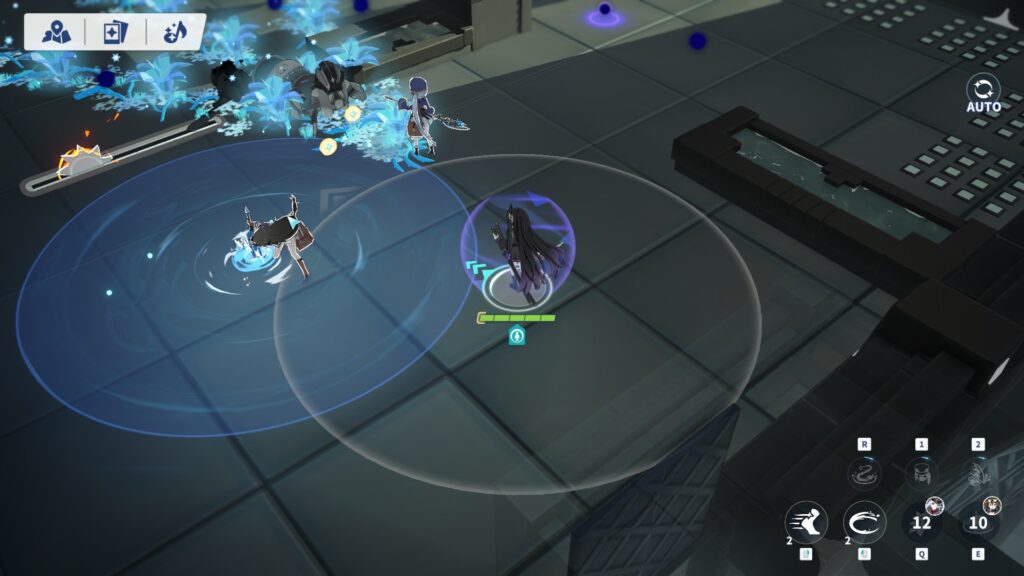 実際のゲーム画面(PC)。QとEを押すと「支援スキル」が発動し、支援キャラ2人が場に登場する。