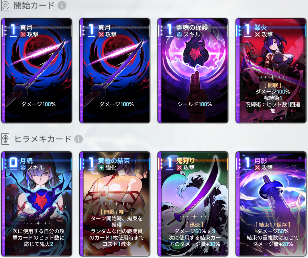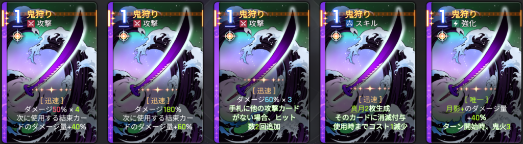 3番目のヒラメキは絶対選ばないように注意。月影が攻撃カードなので、鬼狩りの追加ヒットが発動する場面が少ない上、結束カードへのバフがないため。