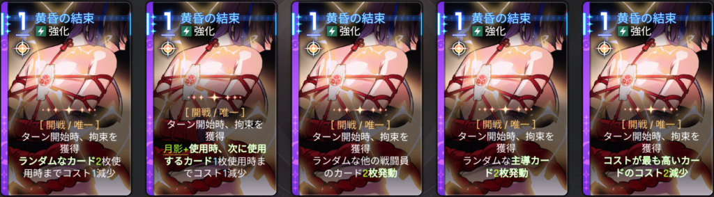 「拘束」のAP獲得不可のデメリットが大きすぎるカード。月影のヒット数増加は強いが、それに見合わない大きなデメリットのため、削除もあり。