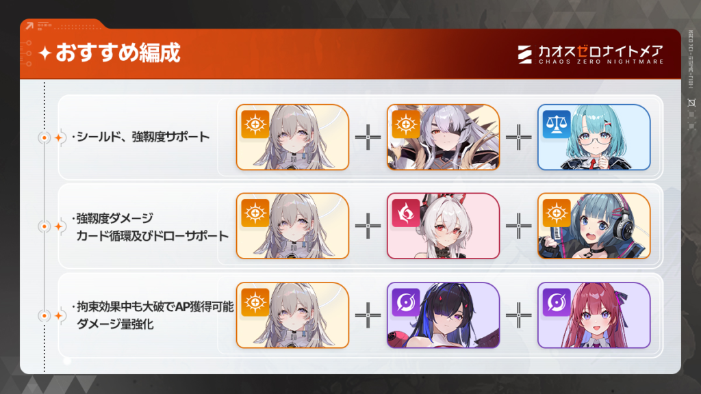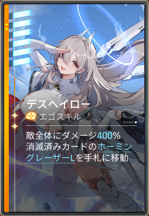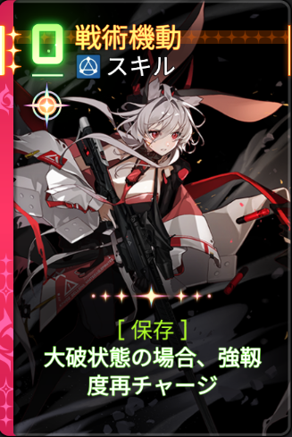 また、全キャラの中で唯一、大破状態の敵の強靭度を再チャージできる戦術起動カードを持つため、替えの聞かない性能。
