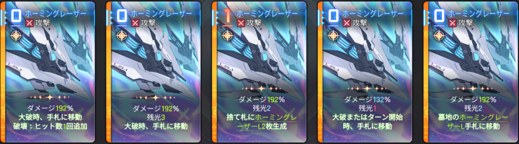 ホーミングレーザーには、敵の強靭度をゼロにする(大破)と、墓地から手札に移動する効果がついています。
