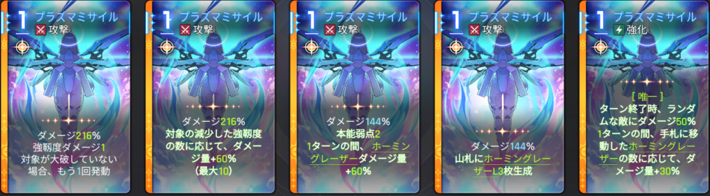攻撃カードの強靭度ダメージ+1、大破状態の場合、ダメージ量+50%